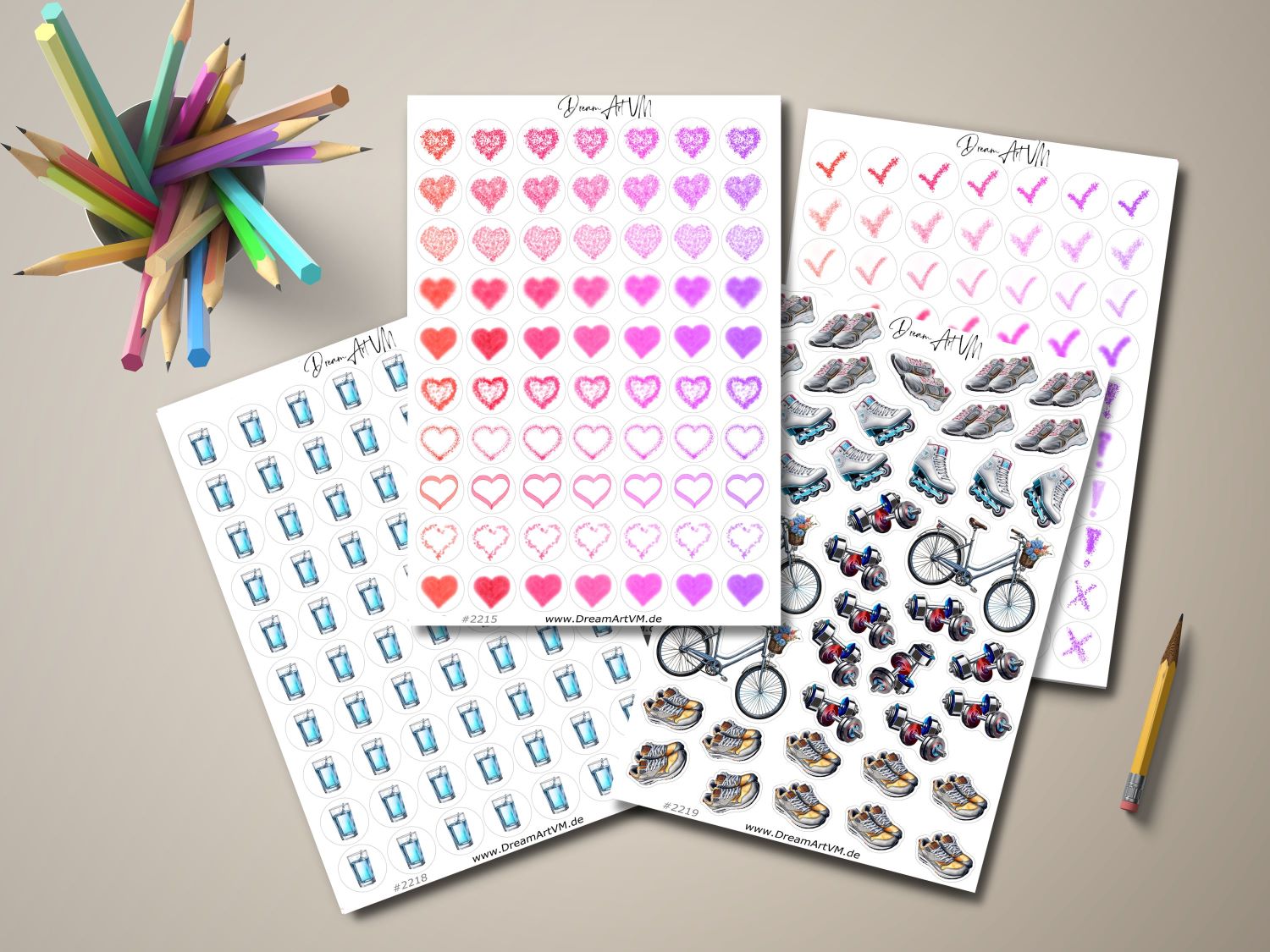 Das DreamArt VM Sticker Set wurde speziell für die Nutzung in Planern entwickelt. Mit Motiven wie Herzen, Häkchen, Getränken, Sportausrüstung und mehr hilft dieses Set dabei, wichtige Aktivitäten und Ziele im Alltag zu organisieren. Nutzen Sie die Sticker, um das Trinken von ausreichend Wasser zu verfolgen, sportliche Aktivitäten zu kennzeichnen oder erledigte Aufgaben abzuhaken. Diese hochwertigen, langlebigen Sticker sind eine motivierende Ergänzung für jeden Planer und helfen dabei, den Überblick zu behalten.