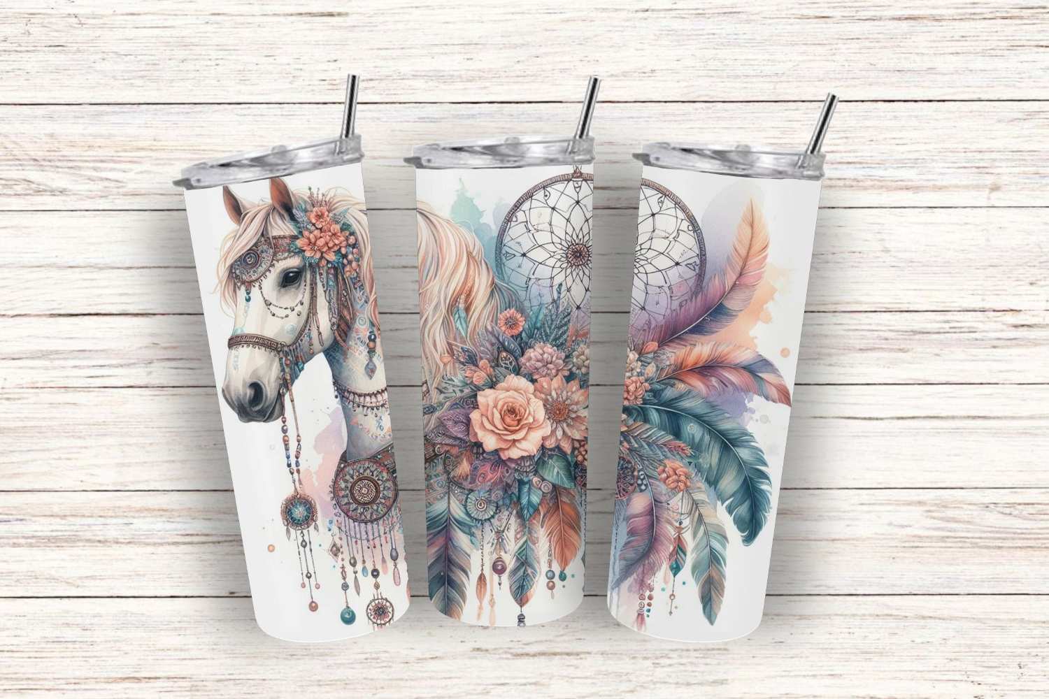 Der Thermobecher „Boho Pferd & Traumfänger“ entführt Sie in die Welt des Boho-Stils mit einem zauberhaften Pferd, geschmückt mit feinen Blumen und Traumfängern. Das kunstvolle Design kombiniert zarte Federn und florale Akzente, was diesen Becher zu einem einzigartigen Hingucker macht. Dank der doppelwandigen Edelstahlisolierung bleiben Ihre Getränke stundenlang heiß oder kalt. Mit einem Fassungsvermögen von 590 ml bietet dieser Becher die perfekte Größe für unterwegs oder das Büro.