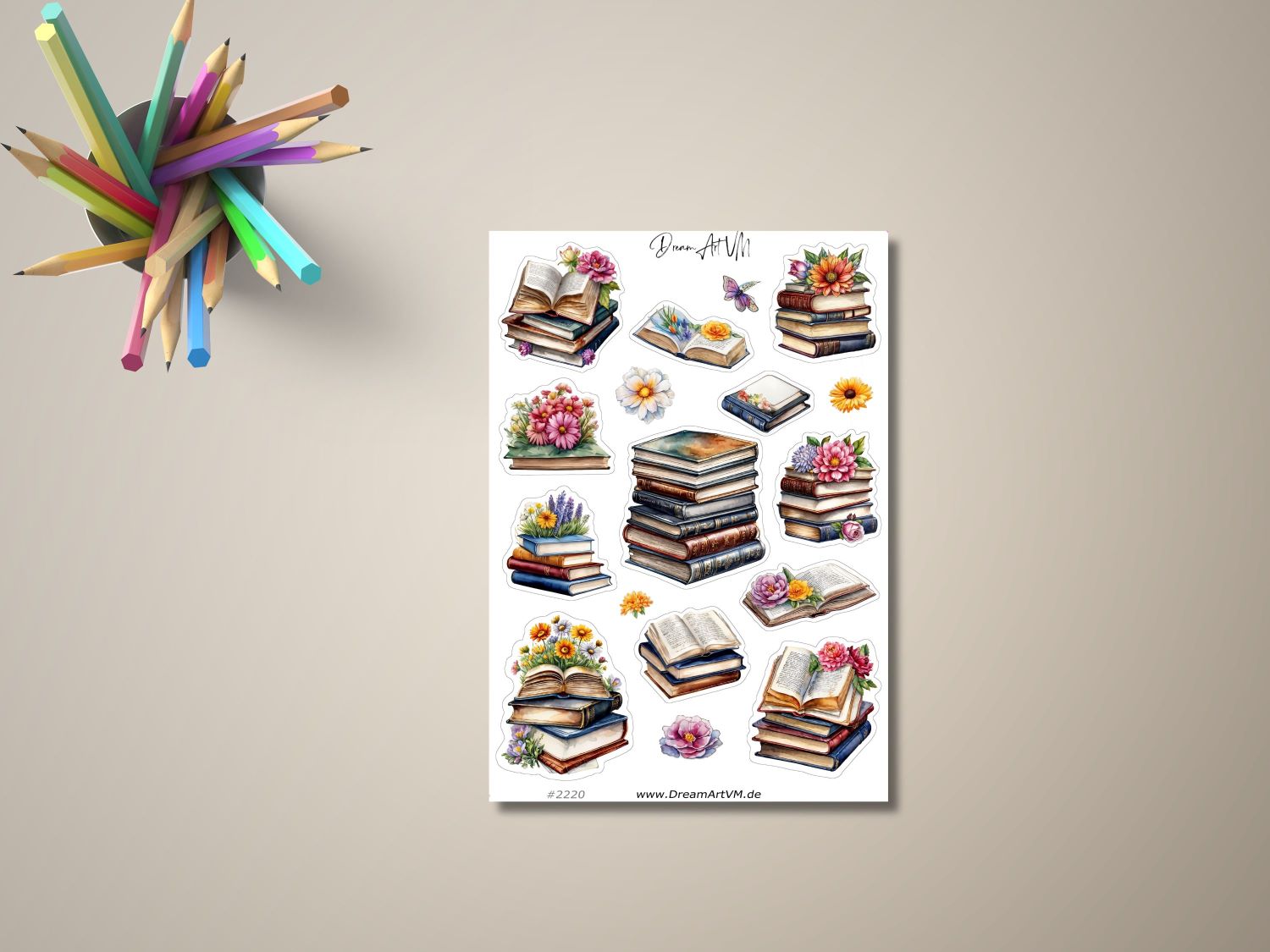 Der „Bücher und Blumen“ Stickerbogen kombiniert die Schönheit klassischer Bücher mit blühenden Blumenarrangements. Dieses detailreiche Design ist perfekt, um Planer, Notizbücher, Scrapbooks oder Alltagsgegenstände zu dekorieren. Die Sticker fangen die Eleganz von Büchern und die Lebendigkeit der Natur ein und verleihen Ihren Projekten einen Hauch von Kreativität und Inspiration.