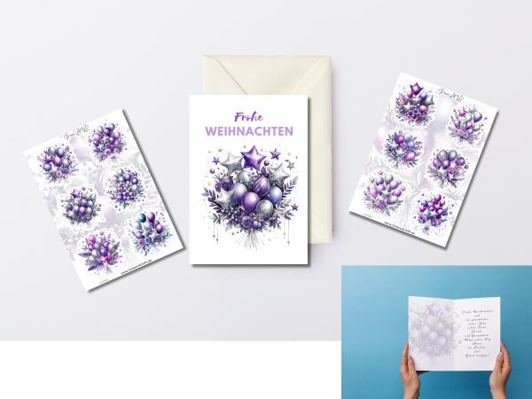Elegantes Weihnachtskarten-Set mit lila und silbernen Stern- und Kugelballons sowie winterlichen Blumenmotiven. Das Set enthält eine Karte mit der Aufschrift 'Frohe Weihnachten', einen Umschlag und zwei Bögen weihnachtlicher Aufkleber mit passenden Design