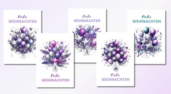Set aus fünf verschiedenen Weihnachtskarten mit lila und silbernen Ballons sowie Sternmotiven. Jede Karte trägt die Aufschrift 'Frohe Weihnachten' und zeigt ein festliches Arrangement aus Stern- und Kugelballons, kombiniert mit zarten winterlichen Zweigen