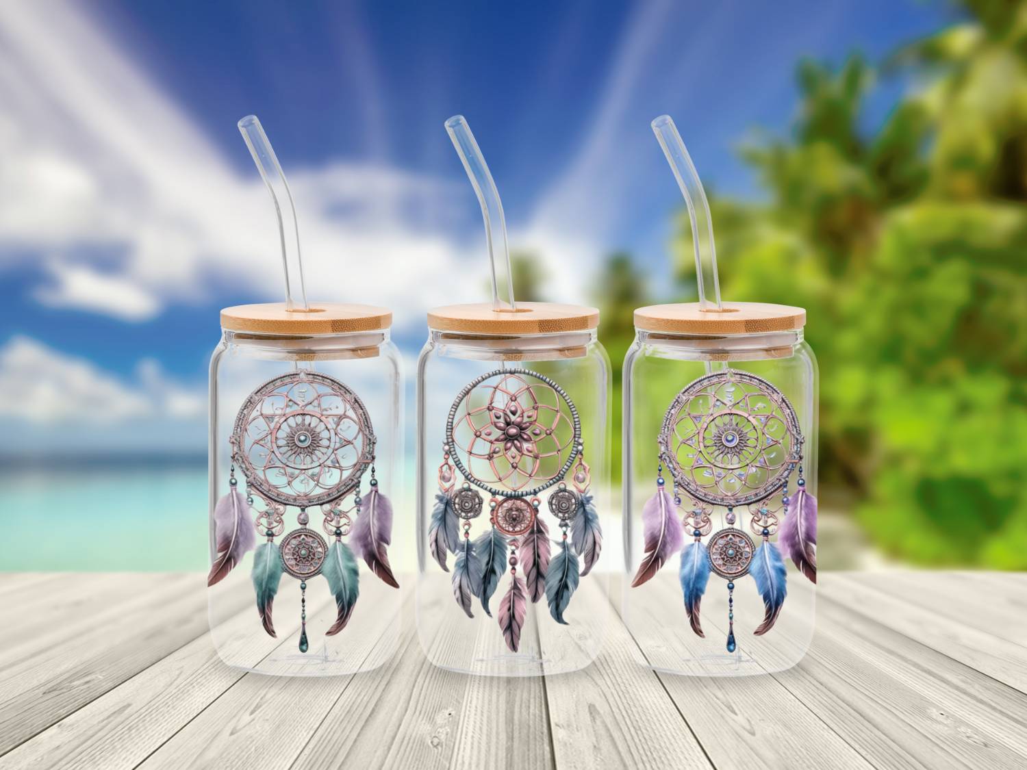 1x Glasbecher mit Traumfänger-Motiv, 1x Bambusdeckel, 1x Glastrinkhalm