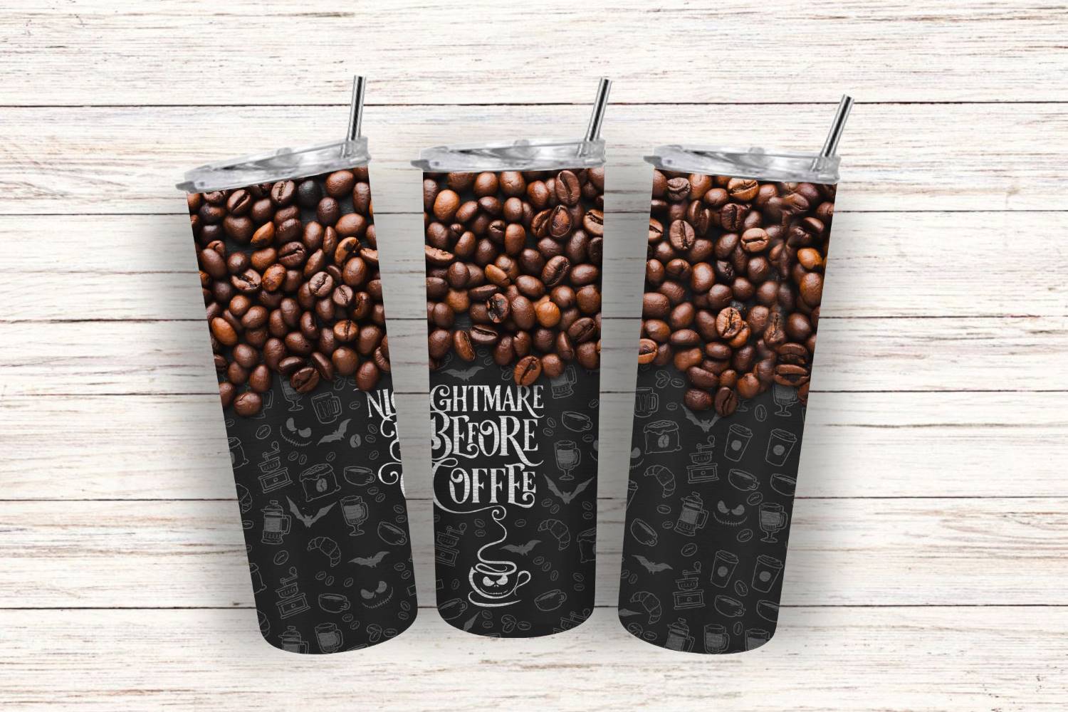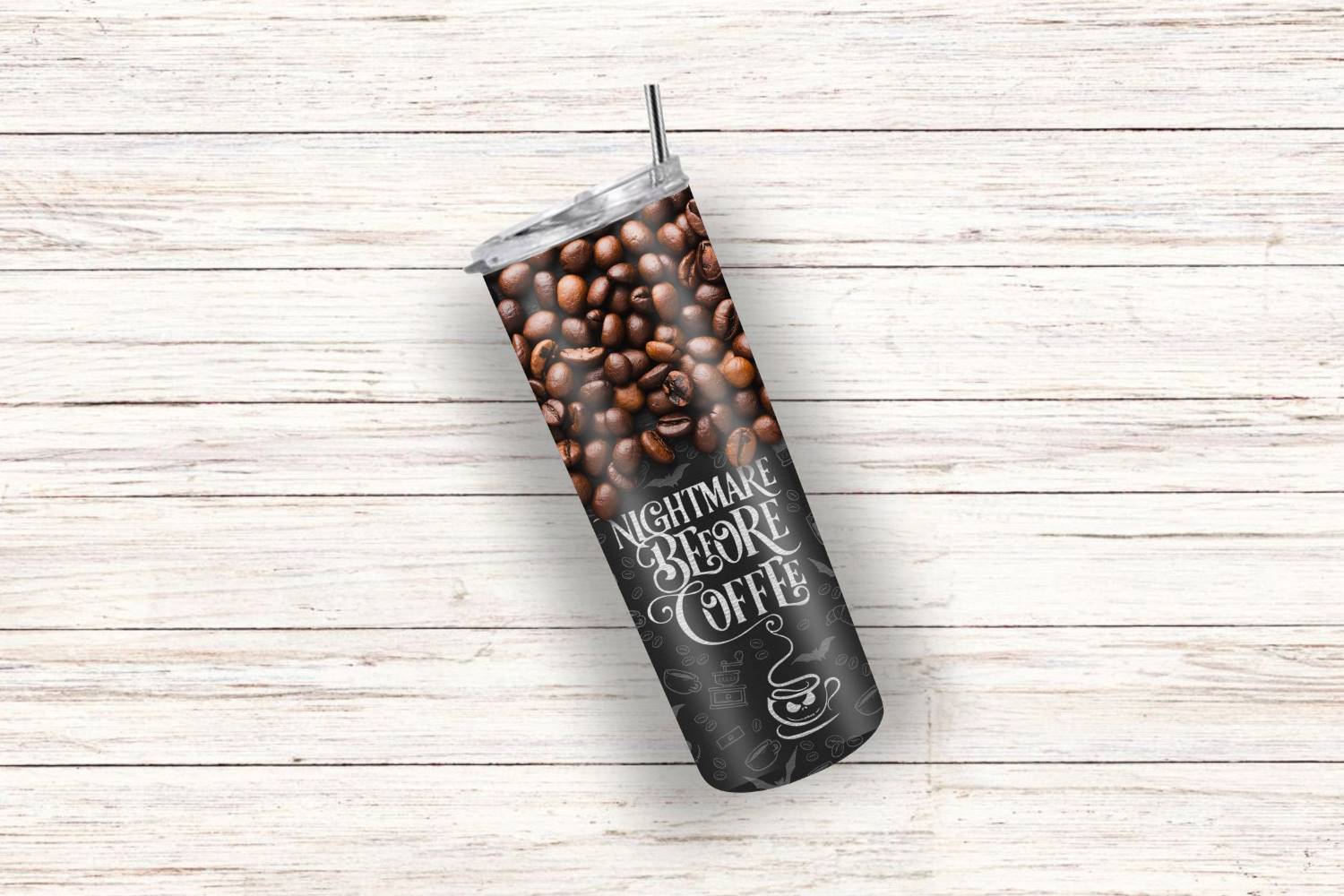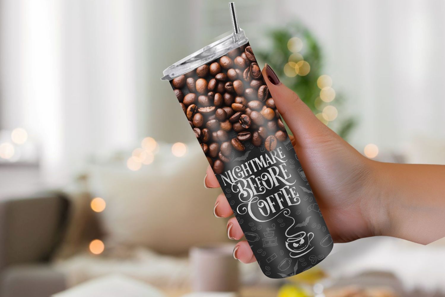 Stylischer Thermobecher aus Edelstahl mit einem Design aus Kaffeebohnen und der Aufschrift „Nightmare Before Coffee“. Dieser praktische und elegante Becher hält Ihr Lieblingsgetränk über lange Zeit warm oder kalt. Mit einem Fassungsvermögen von 590 ml haben Sie immer genug Getränk für unterwegs oder im Büro. Perfekt für Kaffeeliebhaber und verspielte Designs.