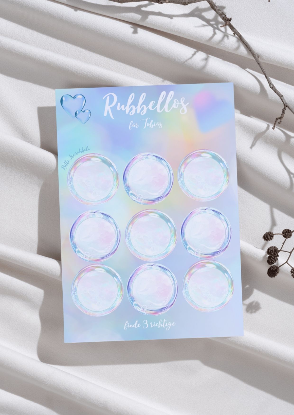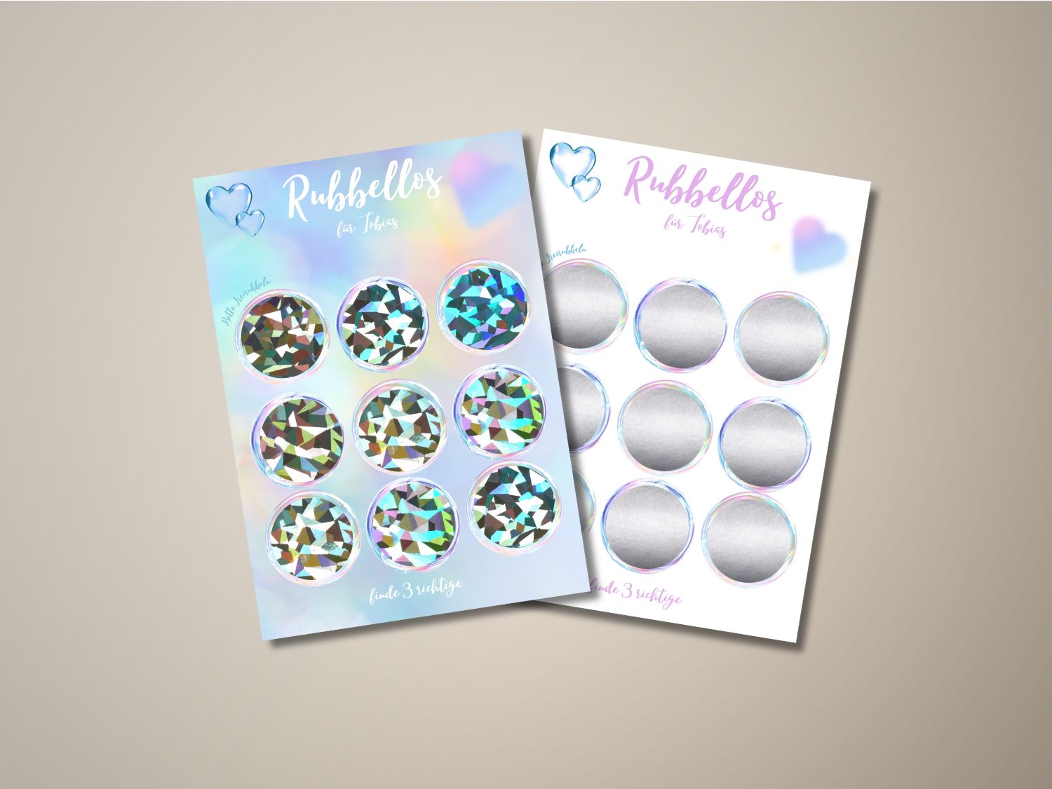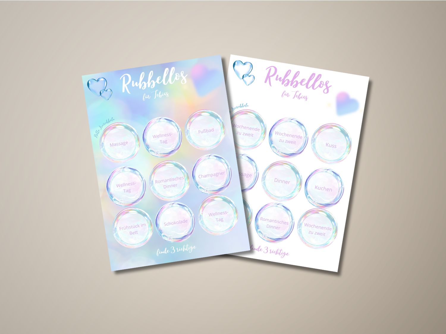 Unsere romantische Rubbelkarte ist personalisierbar mit dem Namen der beschenkten Person und enthält neun Rubbelkreise. Hinter jedem Feld verbirgt sich ein Begriff – wer drei gleiche Begriffe aufdeckt, gewinnt! Das eigentliche Geschenk kannst du selbst festlegen – ob ein Dinner, ein Kinobesuch oder ein Wellness-Tag.