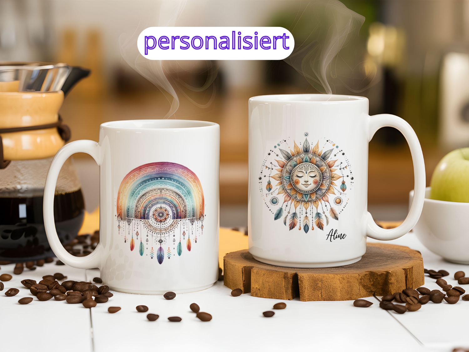 Diese wunderschöne Boho-Tasse mit farbenfrohem Regenbogen und einem kunstvollen Sonnengesicht ist perfekt für alle, die einzigartiges Design lieben. Sie besteht aus hochwertiger Keramik und ist in zwei Größen erhältlich: 350 ml und 425 ml. Diese Tasse kann personalisiert werden, um sie zu einem individuellen Geschenk zu machen. Egal ob für Kaffee, Tee oder heiße Schokolade – sie ist ein stylischer Begleiter im Alltag oder ein originelles Geschenk.