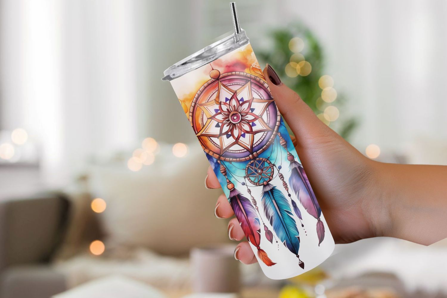 Dieser Edelstahl-Thermobecher überzeugt nicht nur durch seine Funktionalität, sondern auch durch ein lebhaftes Design. Der bunte Traumfänger mit farbenfrohen Federn bringt einen frischen und kreativen Touch in deinen Alltag. Mit einem Fassungsvermögen von 590 ml hält dieser Becher deine Getränke lange warm oder kalt. Der Thermobecher besteht aus hochwertigem Edelstahl und ist langlebig, umweltfreundlich und ideal für unterwegs.